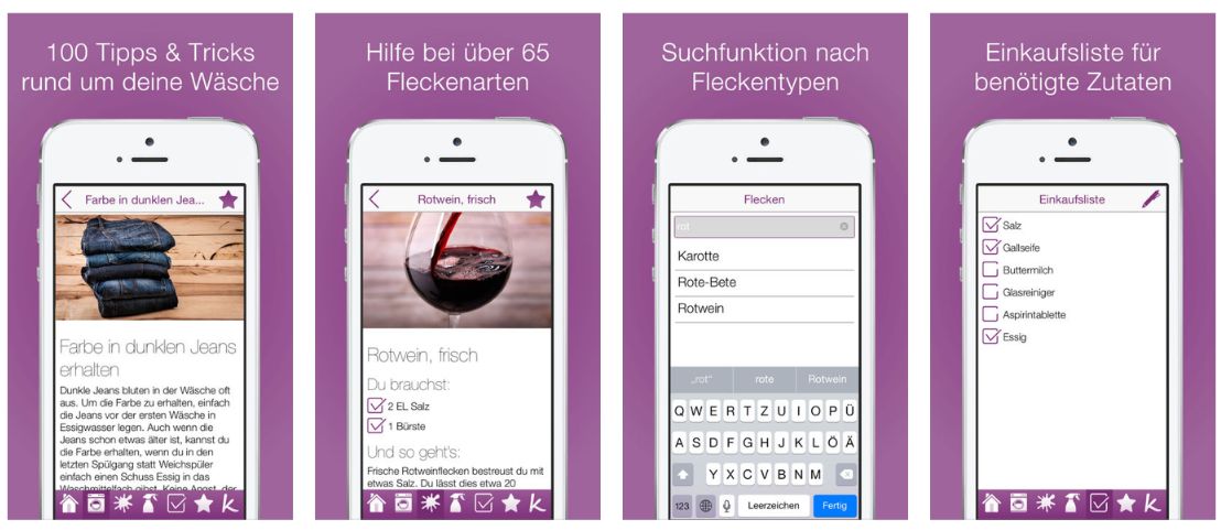 100 tolle Tipps rund um deine Wäsche. So sagst Du Flecken & Co. den Kampf an! Egal, ob Rotwein, Obst oder Kugelschreiber, in dieser App findest Du Fleck-Weg-Zaubermittel, mit denen Du selbst hartnäckigen Flecken ohne Chemiekeulen zu Leibe rückst.